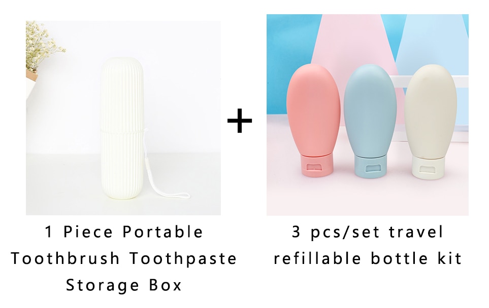 1. Combination includes: 1 Piece Portable Toothbrush Toothpaste Storage Box(Choose one of the colors:white/Green/Gray/Pink ) and 3 pcs/set travel refillable bottle kit